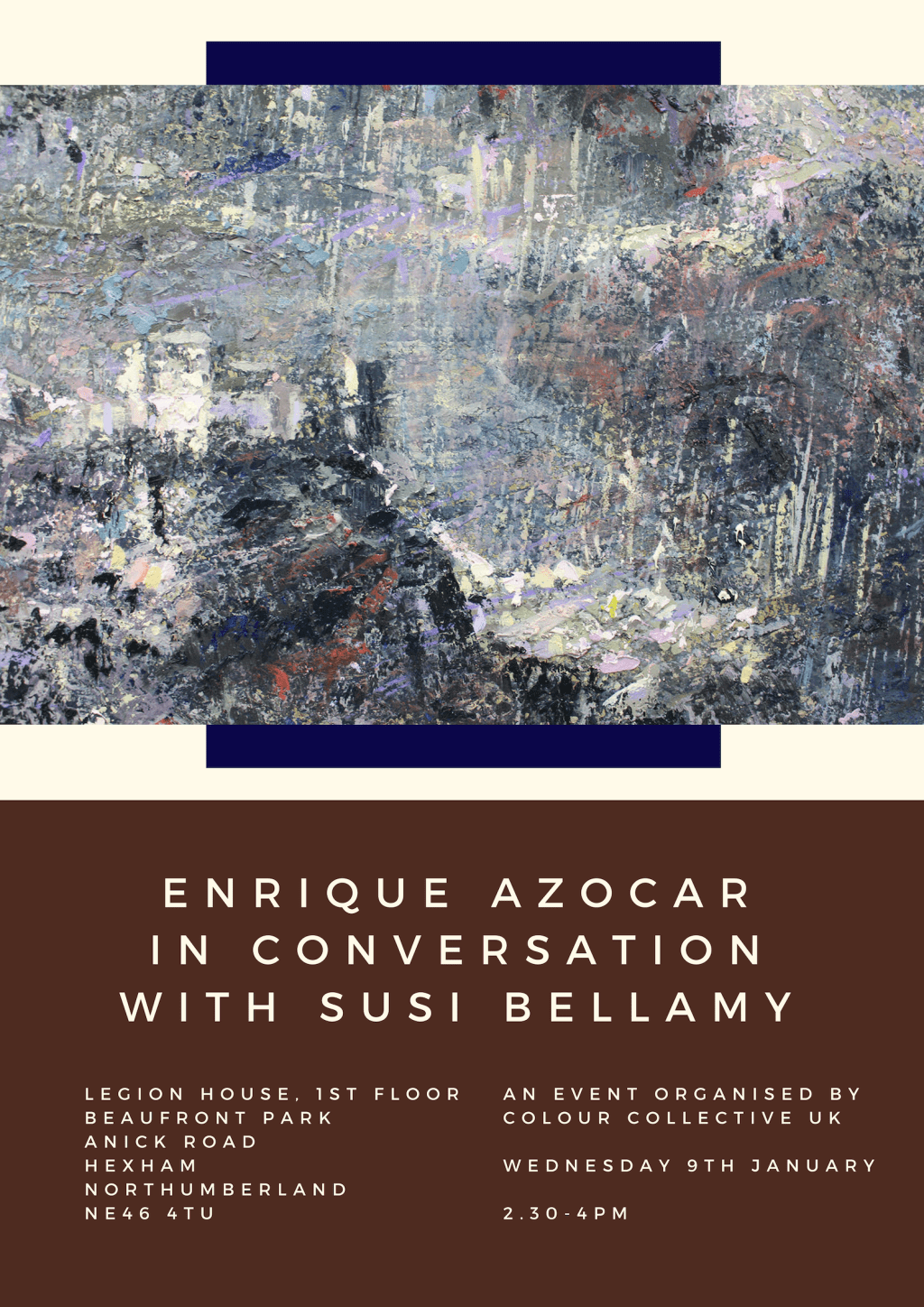 The Colour Collective UK were thrilled to have an artist’s studio visit with Hexham based artist Enrique Azocar. Susi Bellamy, chairman of the Colour Collective UK, interviewed Enrique about his life, work and relationship with colour at his airy studio in Northumberland. Chilean born, Azocar gained distinction in his MA at Northumbria University in 2012 and is now an internationally recognised artist with his work in private and corporate collections around the world. He also teaches painting in his studio which culminates in a show every year to show off their new found talents. During the interview his early work and latest work was contrasted and discussed as well as the alchemy involved in creating his paint from pigments and bees wax. Altogether a fascinating insight into an artist who has embraced Northumberland as his home and sees the light and landscape through different eyes.